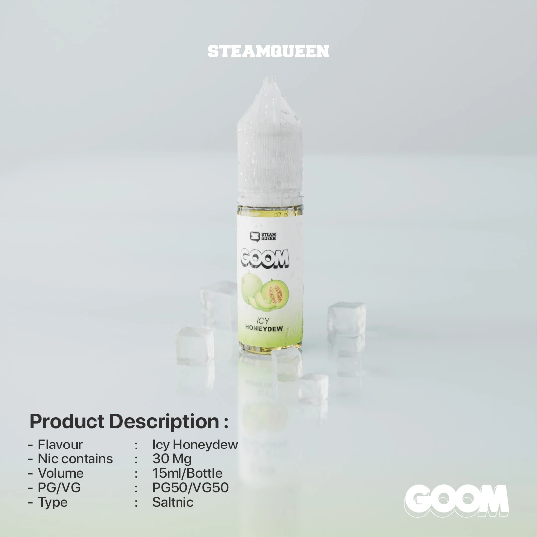 GOOM ICY HONEYDEW 15ML rasa melon madu lembut dengan efek icy menyegarkan. Nikotin 30MG, kemasan 15ML
